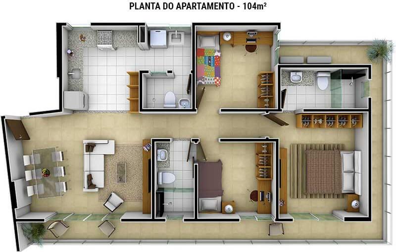 3 Quartos sendo 2 suítes, 1 salas p/ 1 ambientes (estar, jantar), área privativa: 104,00m², Área de serviço , Coz. Americana, Varanda, WC serviço,