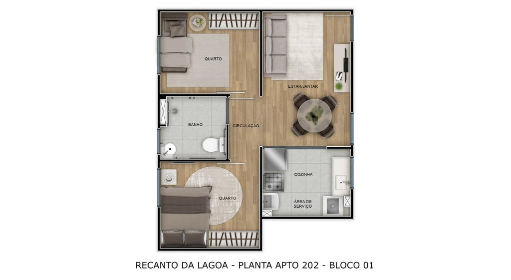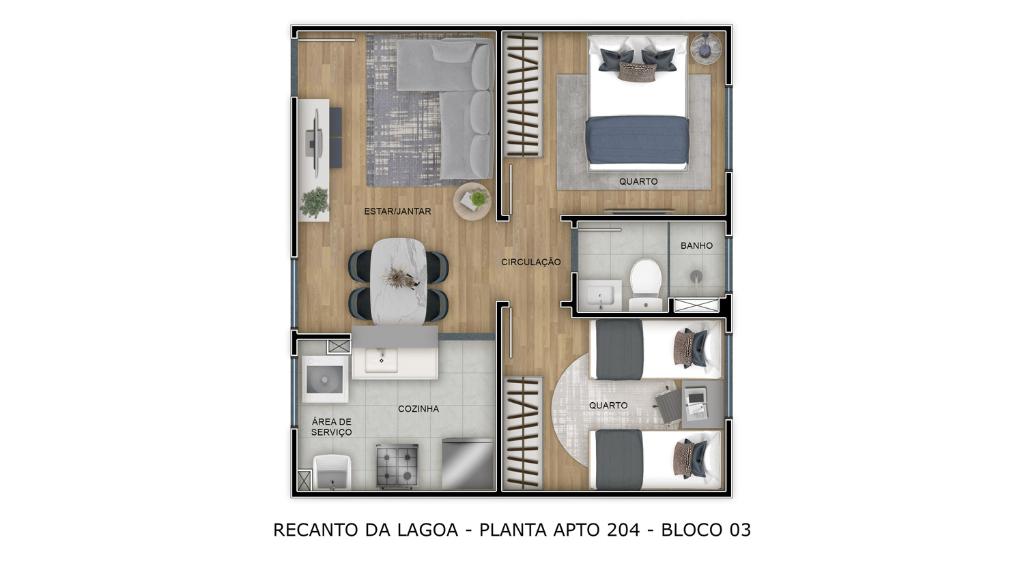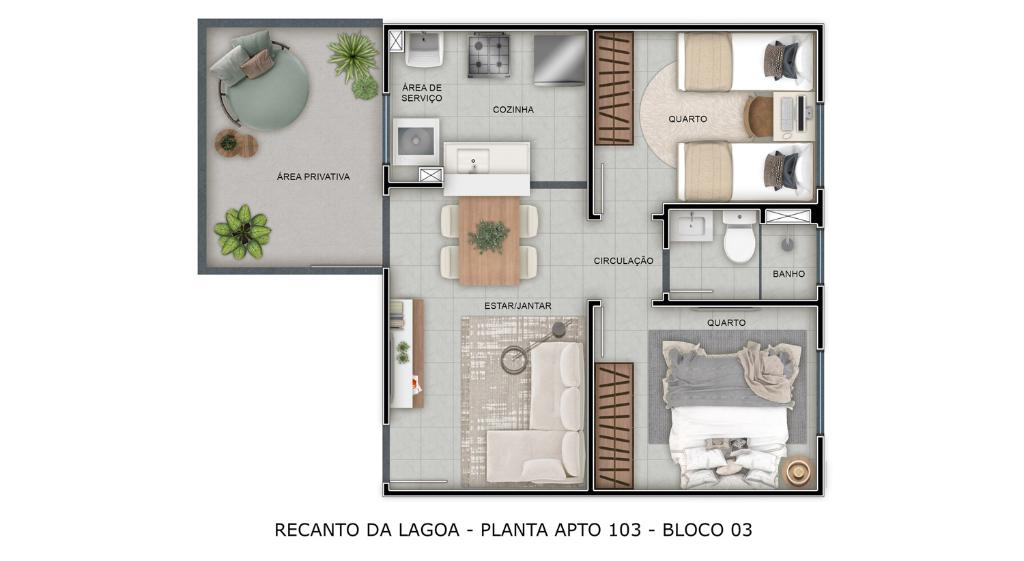 2 Quartos, 1 banheiro social, 1 vaga na garagem, 1 salas p/ 2 ambientes (estar, jantar), área privativa: 40,28m², Área de serviço , Cozinha,