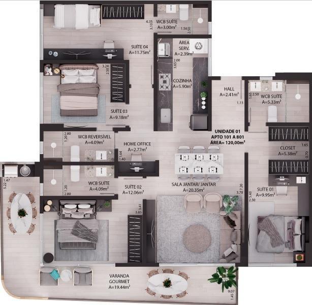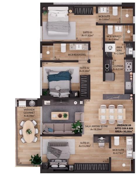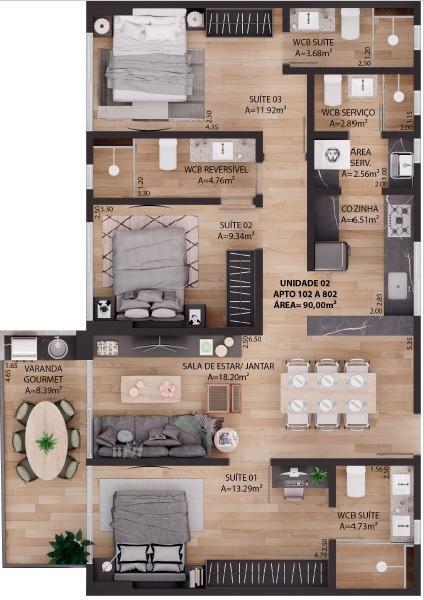 3 Quartos sendo 2 suítes, 3 vagas na garagem, 1 salas (estar, jantar), área privativa: 294,28m², Área de serviço , Cozinha,