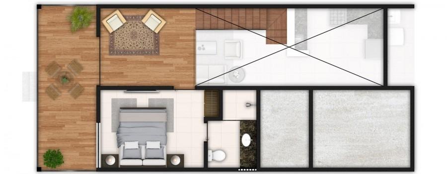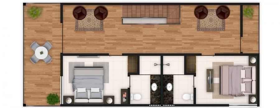 Empreendimento de alto padrão na Praia de Carneiros com 62 unidades, cada uma com 03 quartos, sendo 02 suítes, 01 WC social, sala, cozinha, terraço inferior, varanda superior, mezanino e área de serviço.