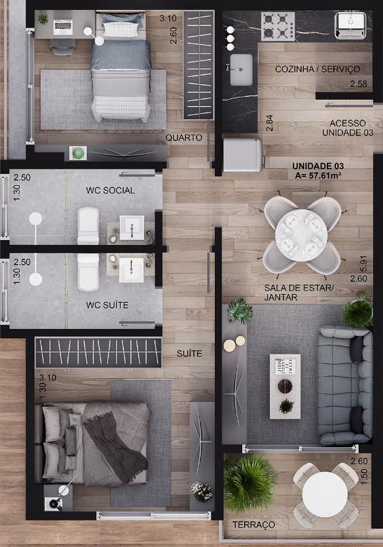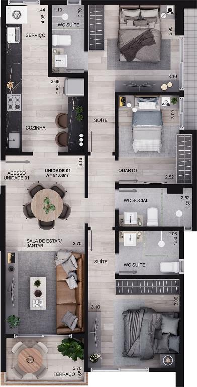 3 Quartos sendo 2 suítes, 1 banheiro social, 1 vaga na garagem, 1 salas p/ 2 ambientes (estar, jantar), área privativa: 82,63m², Área de serviço , Cozinha, Varanda,
