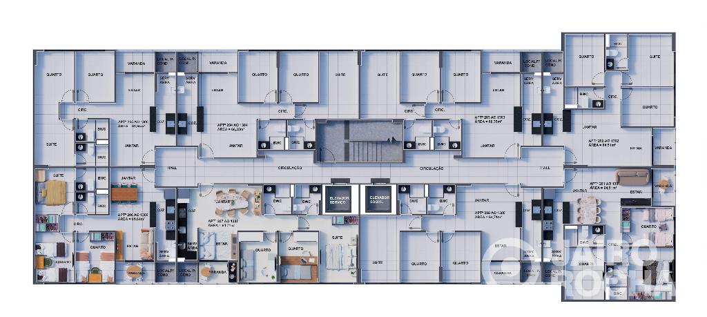 <br>São 208 unidades distribuídas em duas torres (A e B), com 14 andares e 4 apartamentos por andar, oferecendo exclusividade e conforto.