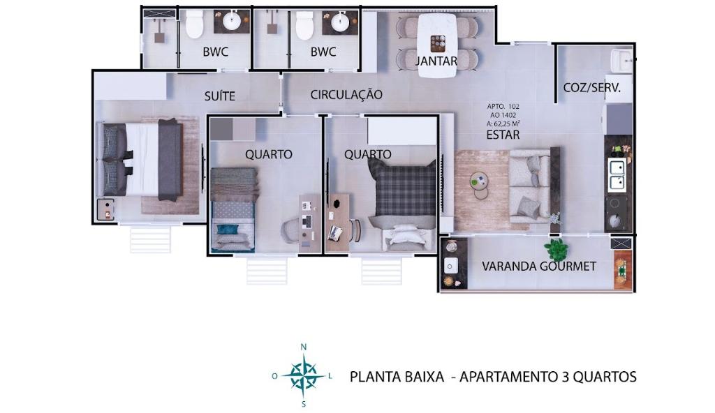 • 2 Quartos sendo 1 suíte